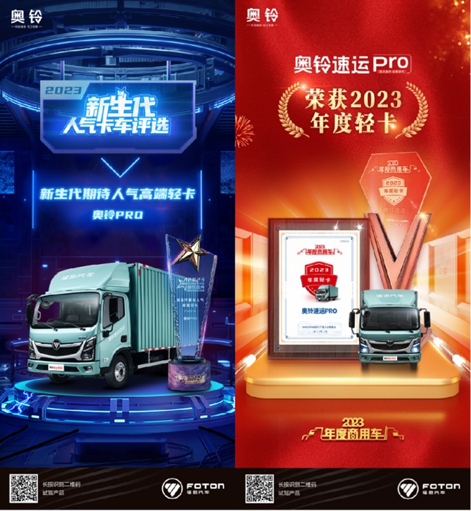 同一时间,在中国汽车流通协会主办的“2023中国商用车产业大会”上,经过商用车行业政、学、研、企、媒五方权威的评审,奥铃速运Pro再获殊荣,斩获“2023年度轻卡”奖。