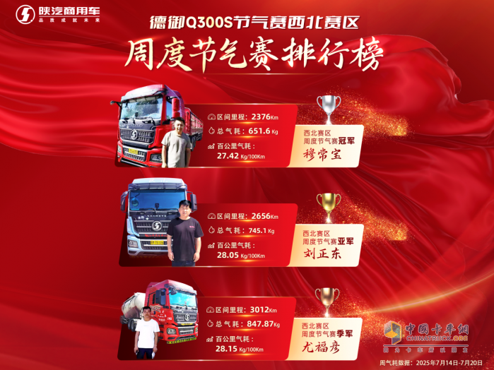 陕汽德御Q300S节气赛西北赛区激战正酣,卡友们驾驶着陕汽德御Q300S,在实战中不断刷新着节气纪录。本周(2025年7月14日—7月20日)周冠军穆常宝师傅更是以27.42kg的气耗再创新低,百公里气耗较上周冠军降了0.95kg。气耗表现出众,口碑实力双丰收