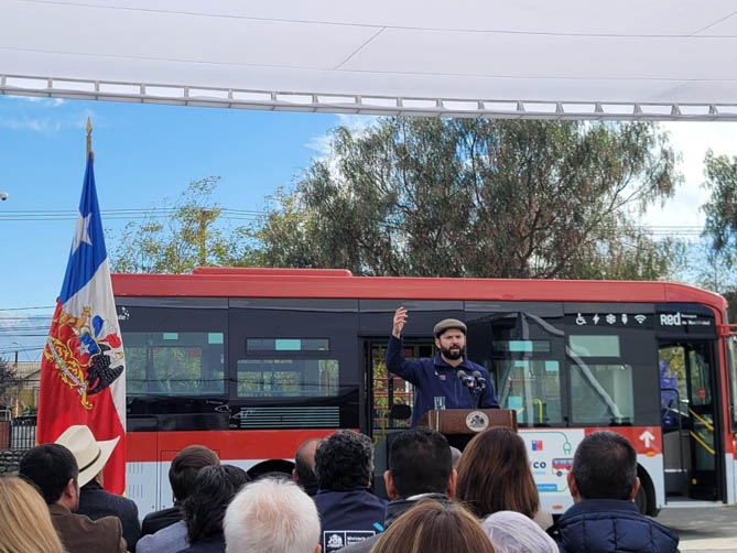 智利时间2024年5月9日,中通客车公司纯电动车批量交付仪式在智利奥希金省兰卡瓜市成功举行。智利总统加夫列尔· 博里奇、智利交通部长胡安·卡洛斯·穆尼奥斯、智利奥希金州长帕布罗.席尔瓦.阿玛雅出席仪式并讲话。(智利总统加夫列尔·博里奇出席仪式并讲话)交付仪式现