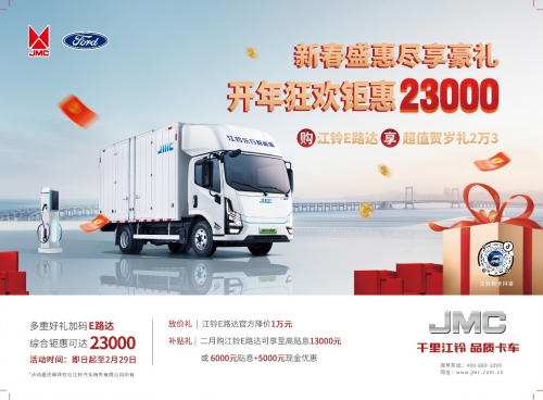 龙年开工大吉,购车享贺岁豪礼。为回馈新老用户,江铃轻卡倾情打造了盛大的超值购车专场活动,感恩长期以来的支持和信任。本次活动以“新春盛惠 尽享豪礼”为主题,价格优惠,礼包丰富,全民尊享,限时好礼不容错过。作为纯电动轻卡的代表,江铃E路达自上市以来凭借卓越的节能、