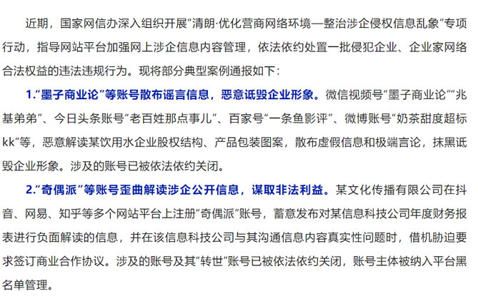 “清朗·优化营商网络环境一整治涉企侵权信息乱象”专项行动公开曝光一批典型案例
