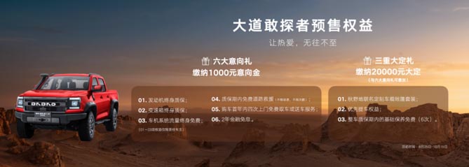 与用户在一起,才是大道真正的热爱。随着敢探者的预售和“人-车-场景-生活”的PUV全新用户生态体系的日益扩展,大道定会让越来越多的用户认识皮卡、了解皮卡、拥有皮卡,大道也将通过自身实力收获更多青睐与支持,与更多的用户一起奔赴热爱,敢探无界!
