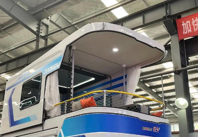 升顶的二楼也大有可为,能够适用全天候的天气场景下运用。后半部是独立可封闭区,可以作为卧室(配备独立屏蔽门与中央空调冷暖风),也可以作为会客室,前半部是半封闭区,设置有环形卡座,配有电控升降栏杆,专为旅居爱好者设计,前后区域提供更加多样化的空间优化。