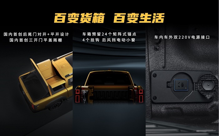 此外,山海炮性能版拥有开放式百变后车箱,国内首创平开+对开式后尾门,方便取放物资;国内首创三开门平盖雨棚,电动控制,可拆卸隔断,增加空间百变性;出厂自带C6拖挂牵引资质,满足3.3吨拖车认证,玩转全场景皮卡车生活。