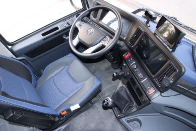 内饰豪 随着用户需求不断提升,卡车驾驶室的舒适性需求日益强烈。针对当前潮流趋势,东风多利卡D12采用全新的高顶双卧平地板驾驶室,幅宽达2315mm,内部空间足够宽阔;主驾位置采用气囊减震座椅,结合全浮式驾驶室,能够有效缓解颠簸路段的震动;卧铺也足够宽阔,还有非常丰富的储物空间,特别适用长途驾乘的起居需求;中控台为对称设计,进行了软包处理,各种功能按键触手可及;像多功能方向盘、液晶仪表、大尺寸中控多媒体大屏、倒车影像等乘用化配置均为中高端卡车主流配置,既提升了驾乘舒适性,同时也为安全行车提供必要保障。