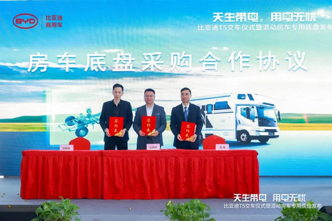 T5新车批量交付,为新能源轻卡市场快速发展注入新动能。高稳定性、高适配性、高承载性底盘产品助力打造安全、舒适、绿色的房车产品。未来,比亚迪将持续完善产品矩阵,为用户提供更安全、更舒适的驾乘体验,推动绿色交通运输高质量发展,为实现国家“双碳”目标努力。