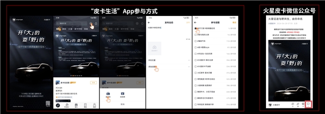 6月28日-7月18日,用户可注册“皮卡生活”App,点击 “开大的 耍野的”火星皮卡新品全球有奖征名活动轮播图参与命名话题发帖,或在火星皮卡微信公众号征名海报评论区进行相关留言参与征名活动。通过皮卡生活APP参与征名即可获得奖励,而命名被选入投票阶段的5名参与者则可获得京东购物卡激励。最终入选车名和获奖名单将于7月下旬公布。