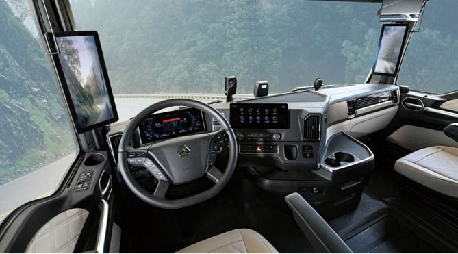 走进驾驶室,汕德卡氢燃料电池牵引车内饰采用乘用车化设计,配备了空气弹簧座椅、超大中控屏,高级影音娱乐系统、自动空调、电动后视镜等。在多项等主/被动智能辅助系统的加持下(如 CMBS(碰撞缓解制动系统)、LDW(车道偏离预警)、ACC(全速自适应巡航控制系统)、DFMS(驾驶员疲劳监测系统)、SLA(限速辅助)、TSR(交通标志识别)、BSD(盲点检测)、AEB(自主紧急制动)),该车实现了L2+级别的自动驾驶,最大限度确保驾运输安全。