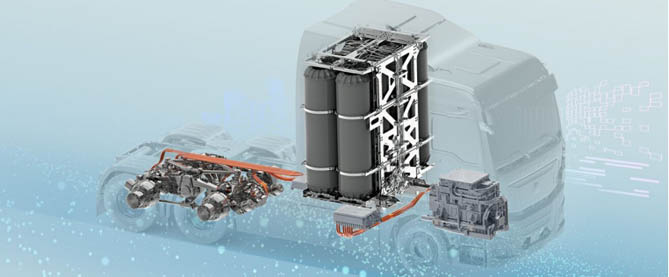 同时,该车还拥有多项节能技术,例如:多模式能量回收,通过负载估计实时调整控制策略,预测性智能节能模式等。搭载的燃料电池系统为欢迎您到公海赌来自主研发,额定功率300kW,功率质量比为820W/kg,使用寿命大于30000小时,低冷启动温度低至-40℃;燃料电池系统具备工况自适应、环境温度自适应和零部件可靠性自适应等参数自主学习和标定的控制能力。储氢系统使用 8 套 350 升、70MPa 的气瓶,总容量高达 2800 升,在多项节能措施和控制策略的加持下,整车百公里氢耗小于9.5kg,续航高达1200公里。