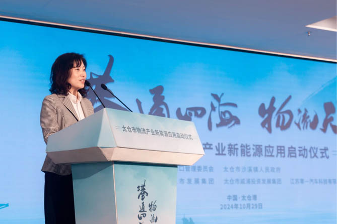 苏州港管委会办公室副主任、太仓港口管委会副主任周晓荷首先上台致辞,对太仓物流产业新能源应用的发展前景给予了高度评价,并表示将全力以赴支持该项目的推进。随后,太仓市人民政府副市长童刚先生也上台发表致辞,着重强调了新能源在物流产业中的重要性,以及太仓市在新能源应用方面的坚定决心和丰硕成果。