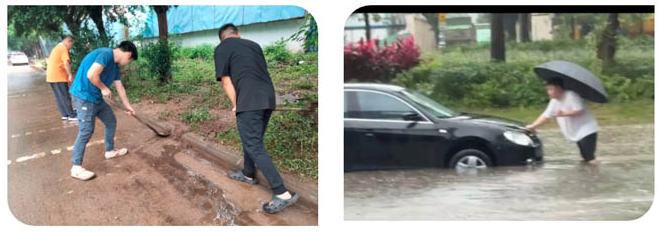 ▲小组成员协助清淤工作,并帮助涉水熄火车辆推车