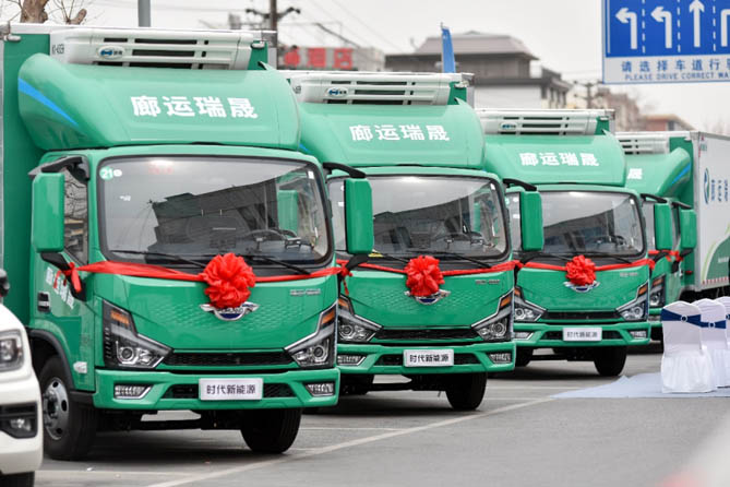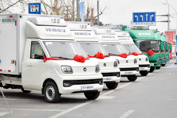 随着新车发车仪式的举行,一辆辆崭新的时代新能源冷链运输车缓缓驶出会场,正式投入到廊坊市的物流运输体系中,这些车辆将成为廊坊市城市绿色货运配送的新名片,为城市绿色可持续发展注入新的动力。