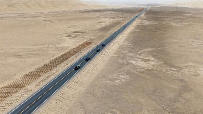 绵延几百公里的沙漠公路,沥青路高低起伏,对车辆的动力性能形成考验。而威麟R08搭载的2.3T涡轮增压发动机与8AT变速箱默契配合,最大扭矩可达420N·m,爬坡超车全不在话下。