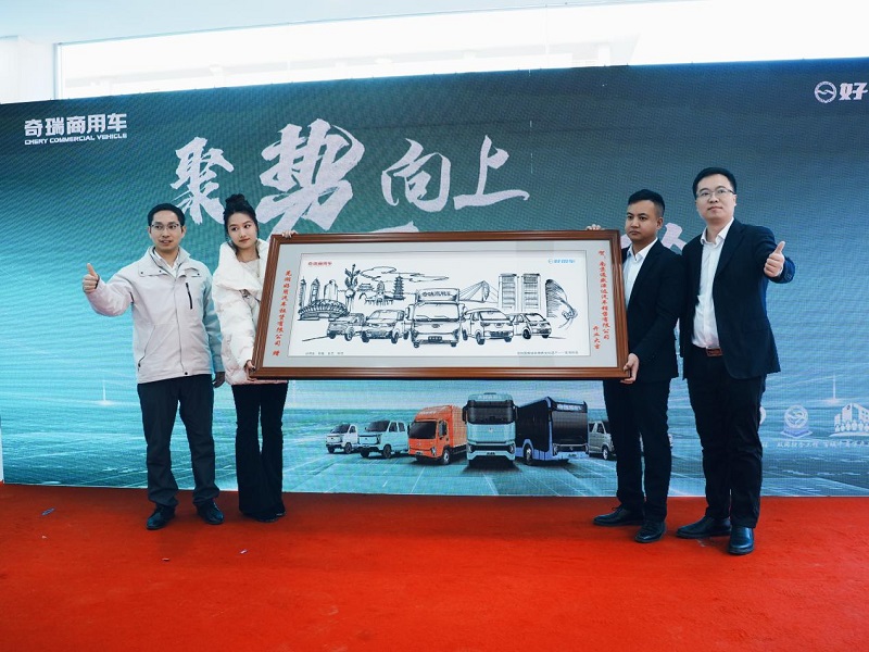 赠礼环节温情满满,好用车生态平台东部战区分管副总宣飞与奇瑞商用车生态事业部总经理助理李涛,向王广祥与徐晓娜送上国家非物质文化遗产——芜湖铁画。这幅以锤为笔、以铁为墨的匠心之作,恰如双方的合作之路:既经得住市场风浪的淬炼,根基坚实如钢;又承载着彼此的匠心与温度,情谊历久弥新。