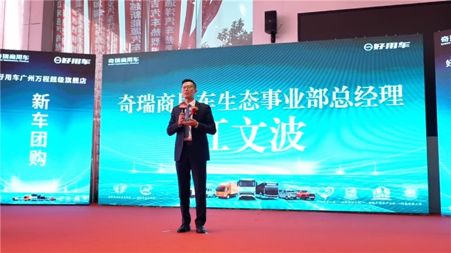 9:10,庆典核心环节正式开启,万程公司董事长隋玉新与奇瑞商用车生态事业部总经理江文波先后登台致辞。隋总分享了万程与好用车携手深耕广州市场的初心,阐述了超级旗舰体验中心打造本地化、一体化商用车服务体系的规划;江总则深入解读双店同开的战略深意 —— 超级旗舰体验中心聚焦商用车 “选、购、租、服” 全周期运营解决方案,好用能途配形象店主打智能维修、智能服务、智慧回收三大核心板块,二者协同构建“车 + 配”一站式闭环服务,标志着奇瑞商用车好用车品牌在大湾区完成从单一销售到生态服务的全面跃迁。
