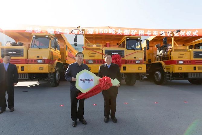本次交付的150吨大型矿卡车型,搭载潍柴集团17升发动机+3300牛米大扭矩8档变速箱+60吨级驱动桥的“矿卡黄金动力系统”,属国内首创、国际领先。车辆累计试运行超过5万小时,总里程超过36万公里,效率提高70%,单位能耗下降10%,可实现一台替代两台的运行效果。