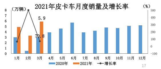 数据显示,3月我国汽车市场产销两旺,分别达到246.2万辆和252.6万辆,同比增长71.6%和74.9%。同时,1-3月,汽车产销635.2万辆和648.4万辆,同比增长81.7%和75.6%。这其中,商用车3月产销57.9万辆和65.1万辆,再创历史新高,中重卡、重卡、轻卡同比增长幅度大,皮卡最为亮眼。
