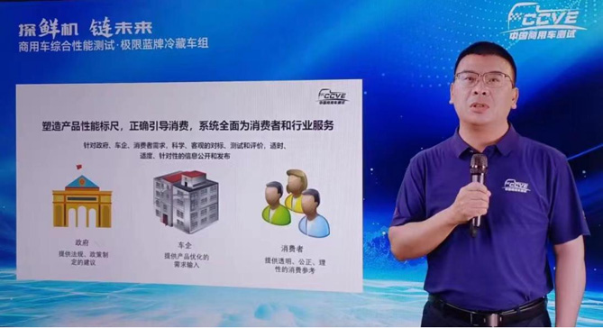 中国能源汽车传播集团党委副书记、副董事长、总经理,《中国汽车报》社社长辛宁介绍商用车综合性能测试(极限蓝牌冷藏车组)初衷
