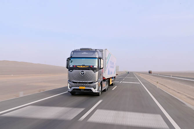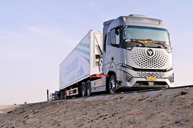 在装载当地货物的欧曼银河燃气车从新疆喀什启动的那一刻,“2024欧曼银河燃气车横贯中国新鲜之旅”这场中国重卡行业首次最长里程极限工况挑战就正式拉开序幕。前一天路程主要是广袤无人区之中的沙漠公路,在经历了戈壁风沙、大漠温差的洗礼之后,5月8日,欧曼银河燃气车从新疆若羌向着青海久治出发。