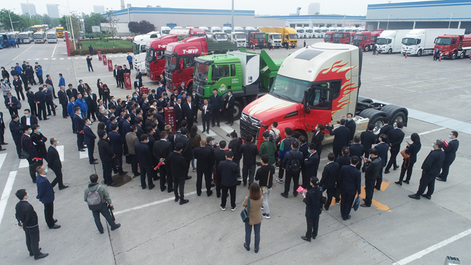 在总装配厂调试广场,也就是总书记曾经考察走过的地方,陕汽进行了精品车辆展示,其中包括陕汽德龙X5000、X6000重卡牵引车,以及轻卡、工程车、专用车辆等产品。