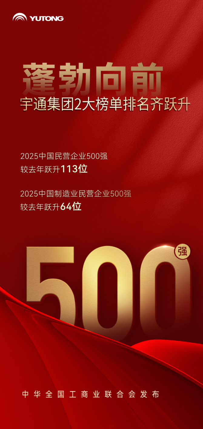 8月28日,全国工商联发布“2025中国民营企业500强”及“2025中国制造业民营企业500强”两项榜单,凭借2024年优异的经营表现,宇通集团荣登双榜并实现排名大幅跃升。其中,在“2025中国民营企业500强”榜单中,宇通排名第279位,较去年跃升113位,在“2025中国制造业民营企业500强”榜单中排名第200位,较去年跃升64位。