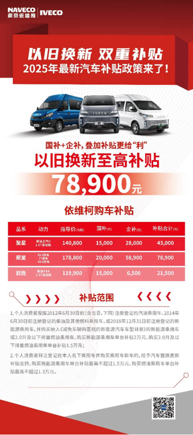嗨!各位老铁,有个超燃的好消息要告诉大家,南京依维柯的“以旧换新”补贴政策来啦,赶紧擦亮眼睛,准备接住这波泼天福利吧!
