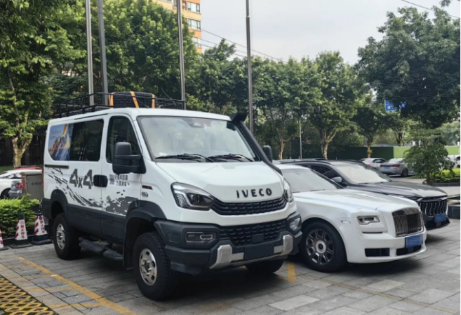 酒店门口的停车场上,依维柯欧霸·山海高大威猛的体型,让它成为众人目光的焦点。