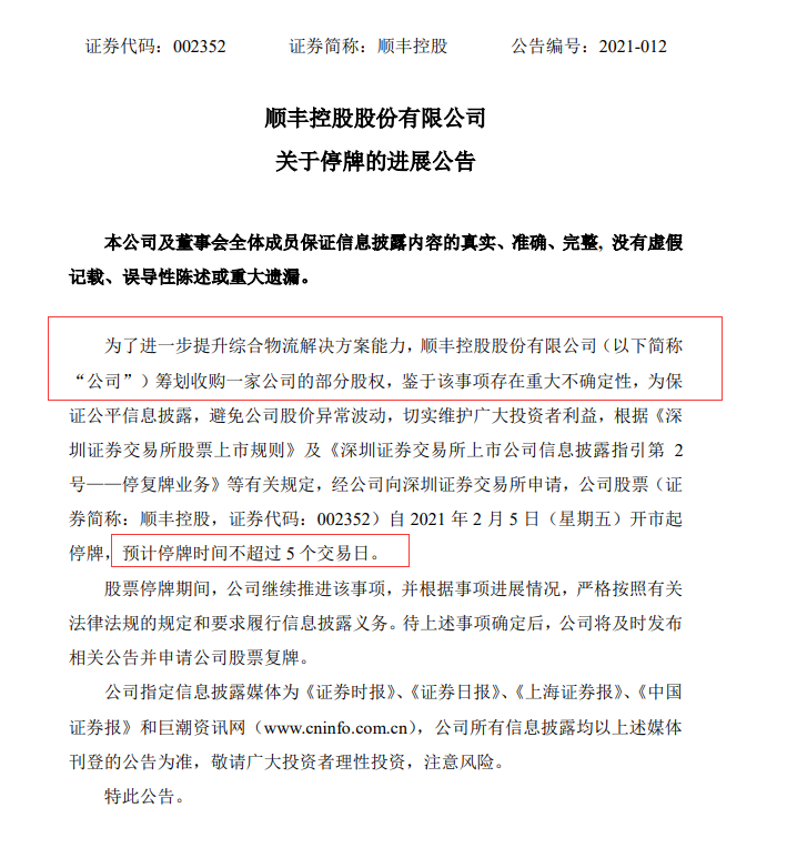 2月5日,顺丰控股公告,为了进一步提升综合物流解决方案能力,公司筹划收购一家公司的部分股权,预计停牌时间不超过5个交易日。同时,在港股市场上,嘉里建设、嘉里物流也于今天早间宣布停牌。