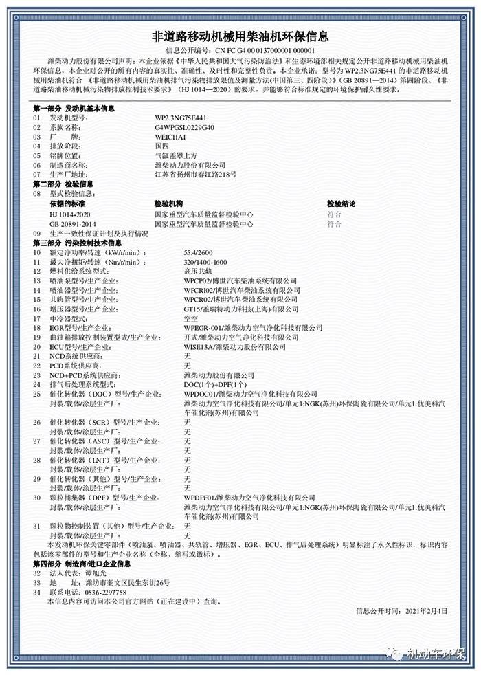 2月4日,在国家环保主管部门监管下,潍柴WP2.3NG75E441发动机完成了所有测试项目,并取得编号为CN FC G4 00 0137000001 000001的环保信息公开单。这也是非道路移动机械国四标准发布以来,行业首张环保信息公开单。