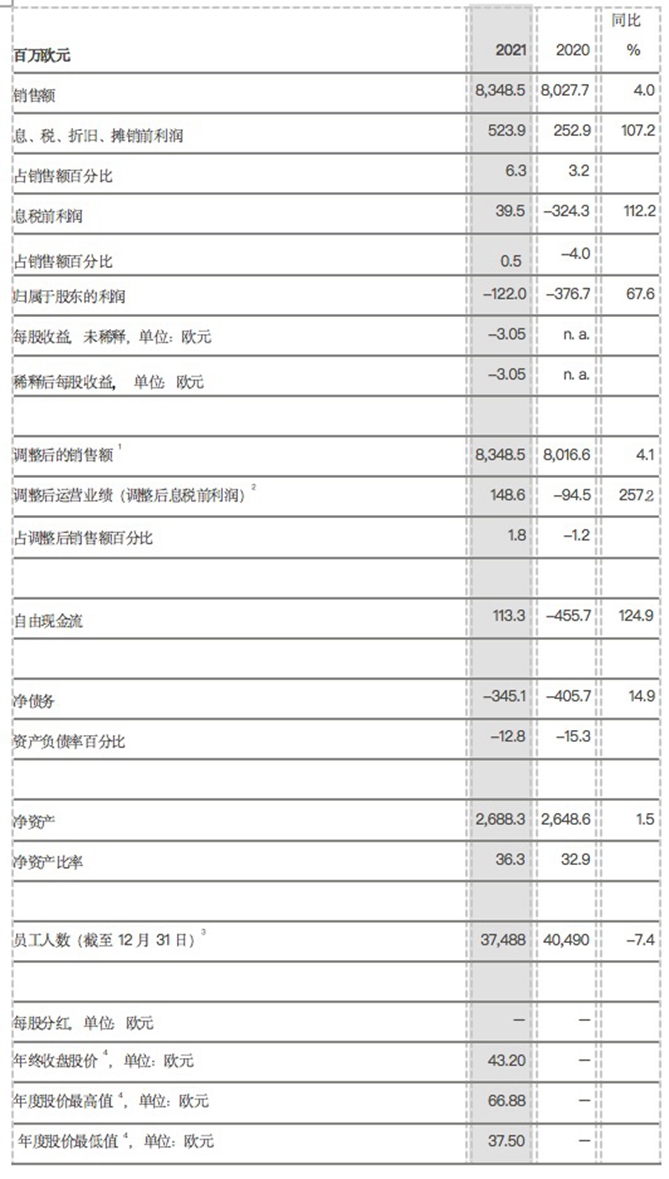 2021财年:销售额达83亿欧元 (2020:80亿欧元)