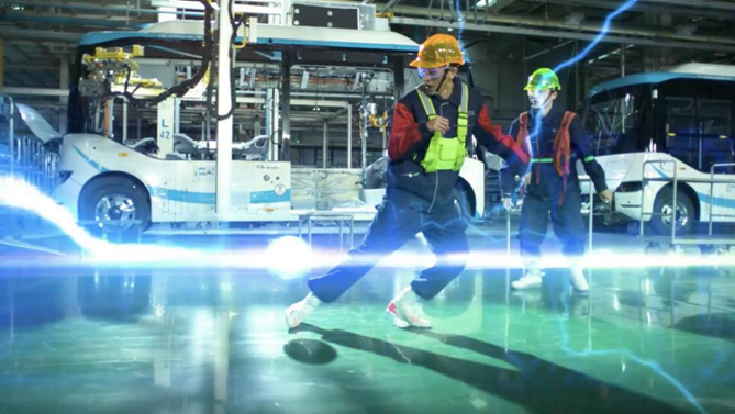 随着双方球员进攻的脚步,场景不断在工厂和不同车辆间快速切换,在高级智能的生产线下,足球赛没有对车辆的生产造成任何影响,搭载自动驾驶系统的巴士还能主动避障,保证了“球员”的安全。最后,“足球”转变为点亮新能源客车的神秘能量,和宇通的新能源产品融为了一体。