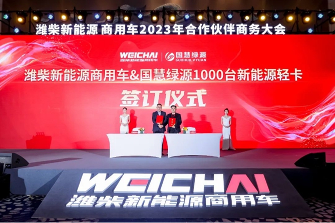 会议期间,1000台新能源轻卡签订仪式同期隆重举行。延续去年成功交付500台大单的口碑效应,今年潍柴新能源商用车与国慧绿源联合,一举创下新能源轻卡开年最大订单。双方将围绕新能源轻卡租赁服务、货源服务、运力服务、维保售后等领域开展全面战略合作。