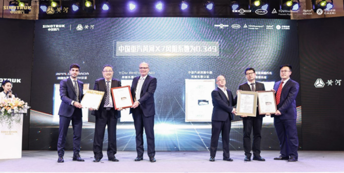 据国际调研数据显示,卡车在时速80公里时,约60%的动力都要用来克服风阻,因此,车辆的风阻越低,油耗也将更低,低风阻技术成为全球知名重卡企业的重要攻坚方向,哪怕是0.01Cd的进步都值得庆祝。放眼国内重卡市场,产品风阻平均超过0.5Cd,进口重卡当中,风靡一时的特斯拉Semi Truck风阻系数约为0.36,而黄河X7的风阻系数仅为0.349Cd,意味着民族重卡现已问鼎全球量产重卡最低风阻。本次为黄河X7颁发0.349Cd风阻系数认证证书的中汽中心华诚认证张晓龙先生用“欲穷千里目,更上一层楼”来表示对欢迎您到公海赌来风阻系数和发动机能效等多项技术突破的认可。