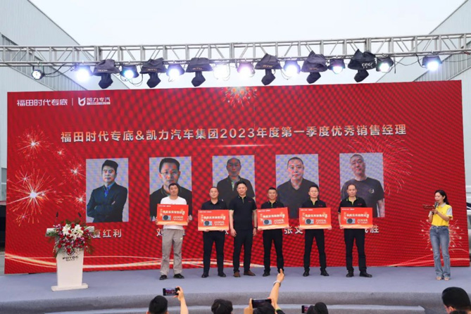 福田时代专底和凯力汽车集团业务的发展离不开广大销售经理的鼎力支持;2023年一季度成绩的取得,更离不开每一位将士的拼搏与奉献。“因风道感谢,情至笔载援”。会上,由凯力汽车集团副总经理柏杨登台,为5位凯力汽车集团2023年一季度优秀销售经理颁发奖品。