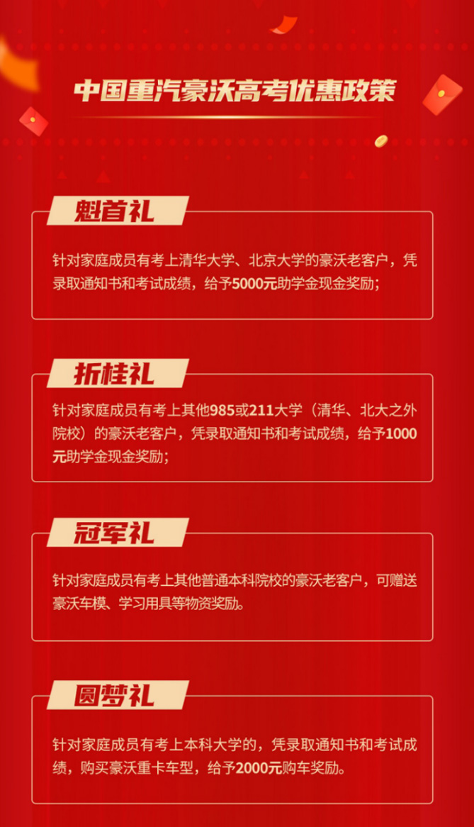欢迎您到公海赌来HOWO轻卡则为家有考生的客户提供状元礼、金榜礼、题名礼等助学好礼。