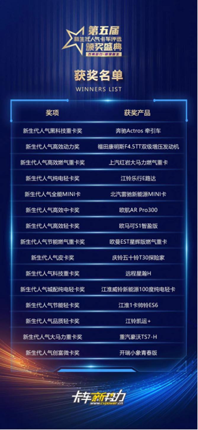 新年新气象,奋起新征程。过往的辉煌成就一段精彩历史,把握未来才能勇立潮头。以客户的⼝碑作为最⾼标准,以年轻化和全球化的视角⻅证中国商⽤⻋变⾰与发展,每一届新⽣代人气卡⻋评选颁奖盛典不仅是荣誉的见证,更是新生代用户与企业间的沟通桥梁。扩大用户声量,提升卡友地位,为更多卡友提供发声渠道与展现自我的舞台,第五届新生代人气卡车评选颁奖盛典的顺利举行只是开始,今后,卡车新势力将携手更多卡友一起,发出新声量、拓展新视野、开发新渠道,为商用车行业的转型焕新注入年轻新势力。