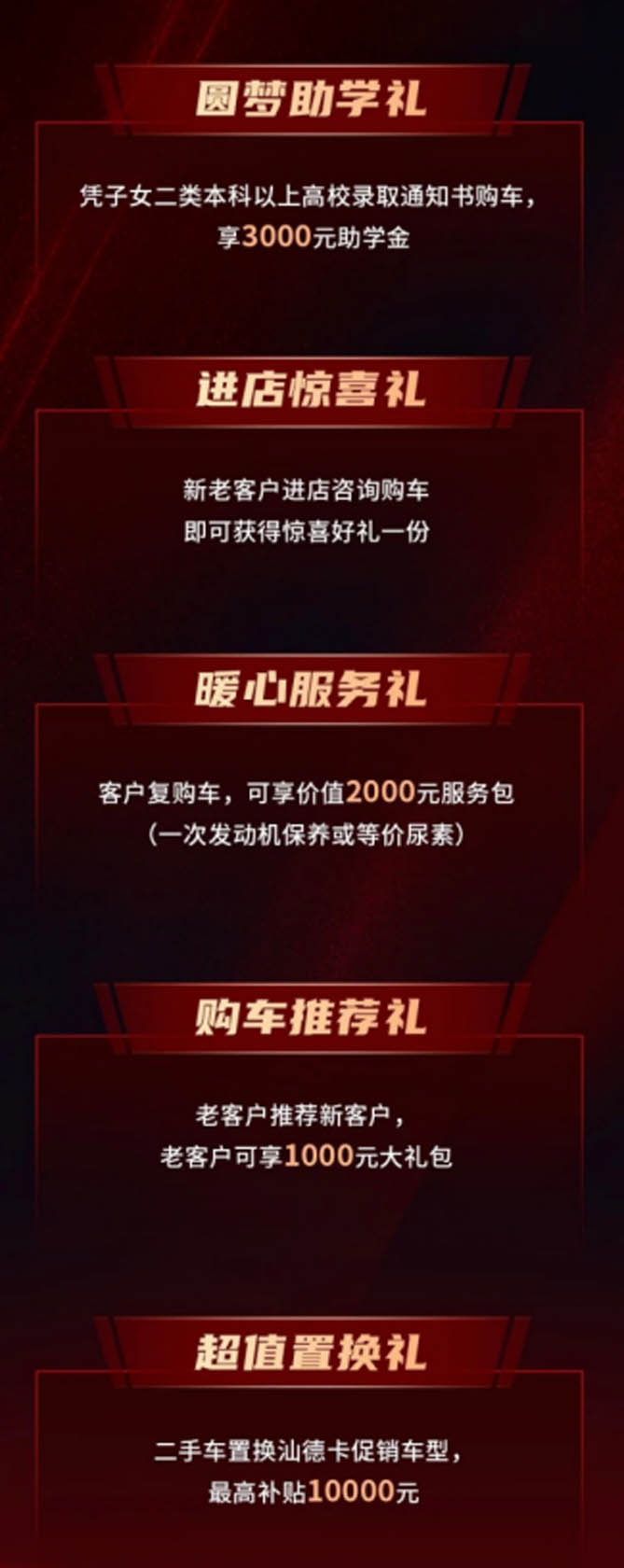 6月7日-8月31日期间,HOWO轻卡重磅推出状元礼、金榜礼、题名礼等助学好礼。状元礼:凡有直系亲属考入国防七子高校的新购车客户,2000元定金即可享受10000元的购车抵扣;金榜礼:凡有直系亲属考入985或211高校的新购车客户,2000元定金即可享受6000元的购车抵扣;题名礼:凡有直系亲属考入其他高校的新购车客户,2000元定金即可享受4000元的购车抵扣。扎实有料的钜惠多重豪礼,尽显HOWO轻卡的品牌诚意。