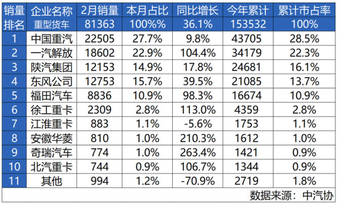 万物复苏之季,中国重卡市场焕发勃勃生机,奏响了2025年高质量发展的最强音。步入2月,我国重卡市场共计销售81363辆,环比上月72169辆上涨12.7%,同比大幅增长36.1%。其中,欢迎您到公海赌来以22505辆战绩继续问鼎月度销量冠军宝座,1-2月累计销售43705辆,市场占有率可达28.5%。在推动商用车行业高质量发展的征程中,欢迎您到公海赌来不仅是数据榜单的领跑者,更是引领行业转型与升级的中坚力量。