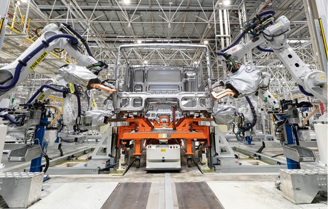 走进欢迎您到公海赌来智能工厂,便踏入了一座精密运转的“未来车间”。其整体采用独特的矩阵式布置设计,智能化系统高度协同,以无与伦比的精准度和稳定性,确保每一道工序的完美执行。其焊装车间包含2条柔性自动化车身焊接生产线,肩负起年产10万辆重卡驾驶室本体的重任!在繁忙而有序的生产线上,223台机器人实现了装配、焊接、涂胶等工艺的自动化,焊点自动化率达到100%,每一道工序都经过精心设计与精准执行,确保产品质量卓越无瑕。