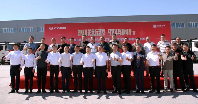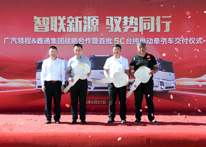 5月21日,广汽领程新能源商用车有限公司(以下简称“广汽领程”)与鑫通集团在新疆伊犁州新源县首平顺德物流园成功举行首批50台纯电动牵引车的交付仪式。此次交付,标志着双方共建新源县"绿色运输生态示范区"进入实质落地阶段。伊犁州商务局党组成员、办公室主任张强,新源县政府党组成员、工业园区党工委书记余勇,新源县商务和工业信息化局党组书记王玉新,扬州市援疆指挥组项目办主任康磊,广东省对口支援新疆工作前方指挥部驻疏附县工作队曹露组长、张成副组长,广汽传祺新疆总经理骆海天,鑫通集团董事长赵冠军,新源县首平顺德运输有限公司总经理李济慎,广汽领程党委书记夏强等领导和嘉宾代表出席仪式。