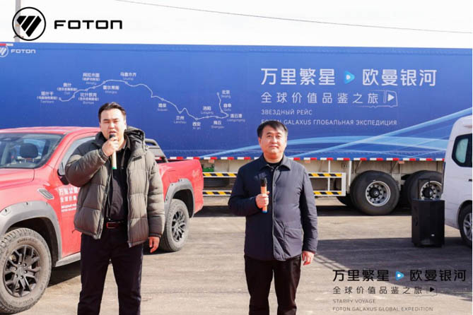 2025 年 3 月 24 日至 26 日,“万里繁星・欧曼银河全球价值品鉴之旅” 自中国霍尔果斯荣耀启程,跨越漫漫征途,成功抵达哈萨克斯坦的阿拉木图州。在阳光灿烂的星辰集市,一场备受瞩目的欧曼银河重卡经销商用户品鉴活动也盛大开启。活动现场,欧曼银河重卡以其卓越的性能和领先的科技配置,成为全场焦点,吸引了众多当地经销商以及用户的关注。哈萨克斯坦前交通部长如斯兰先生也亲临现场并发表致辞,为活动增添了非凡影响力,彰显出欧曼重卡在当地交通运输领域的重要地位。