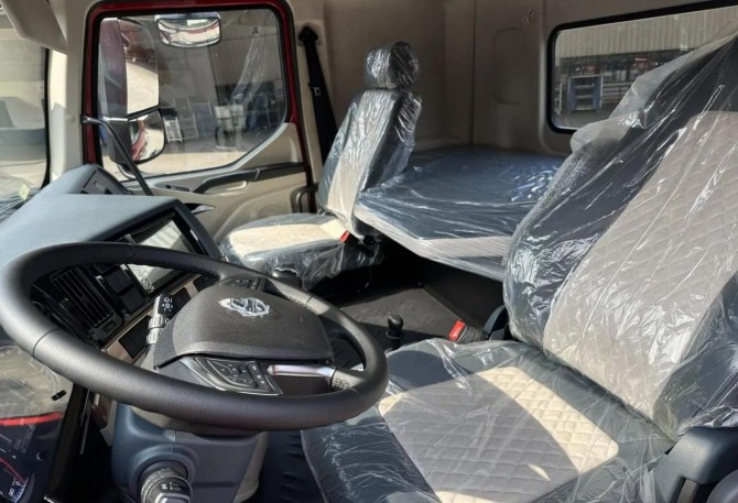 整车驾驶室采用H57S创富版的新款驾驶室 1.92米内高+大面积纯平中间地板驾乘人员活动自如,92公分超宽卧铺,真皮方向盘+皮质气囊司机座椅,驾驶轻松舒适;后桥气囊悬挂车型,驾驶更平稳,运输精密仪器、名贵水果伤损更少。