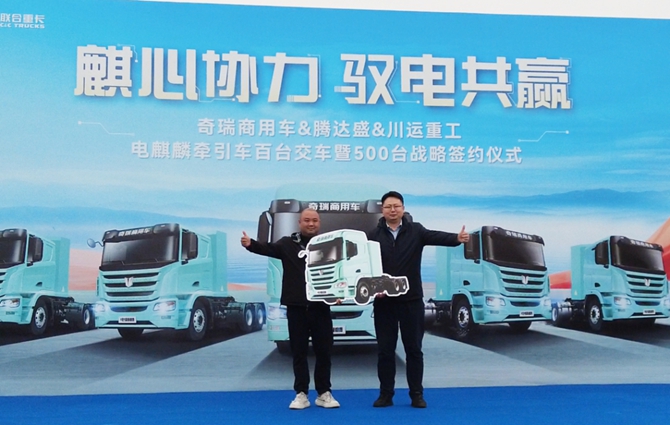 2026年3月12日,以“麒心协力 驭电共赢”为主题的奇瑞商用车&腾达盛&川运重工电麒麟牵引车百台交车暨500台战略签约仪式在四川德阳隆重举行。现场电麒麟牵引车整齐列阵,共启西南绿色物流迈向规模化运营的关键一步。